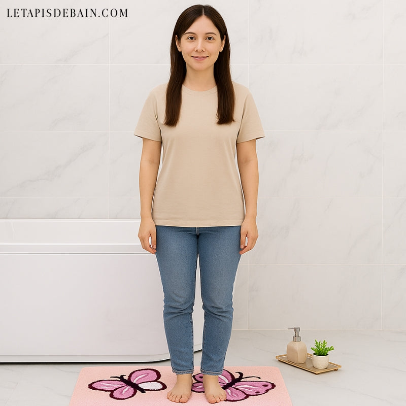 Ton colis contiendra un magnifique Tapis de Bain Papillon, prêt à sublimer ton espace de bien-être.