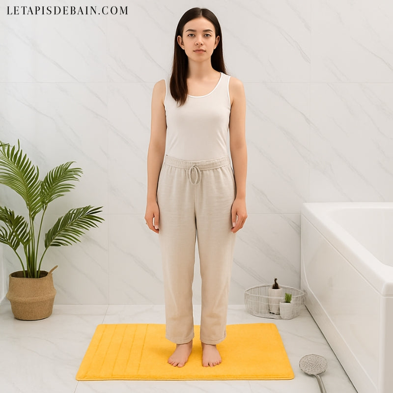 Transforme ta salle de bain en un havre de paix en ajoutant ce tapis jaune à ta décoration. Procure-toi dès maintenant ce tapis de bain tendance pour une expérience de bien-être inégalée au quotidien. 🛀